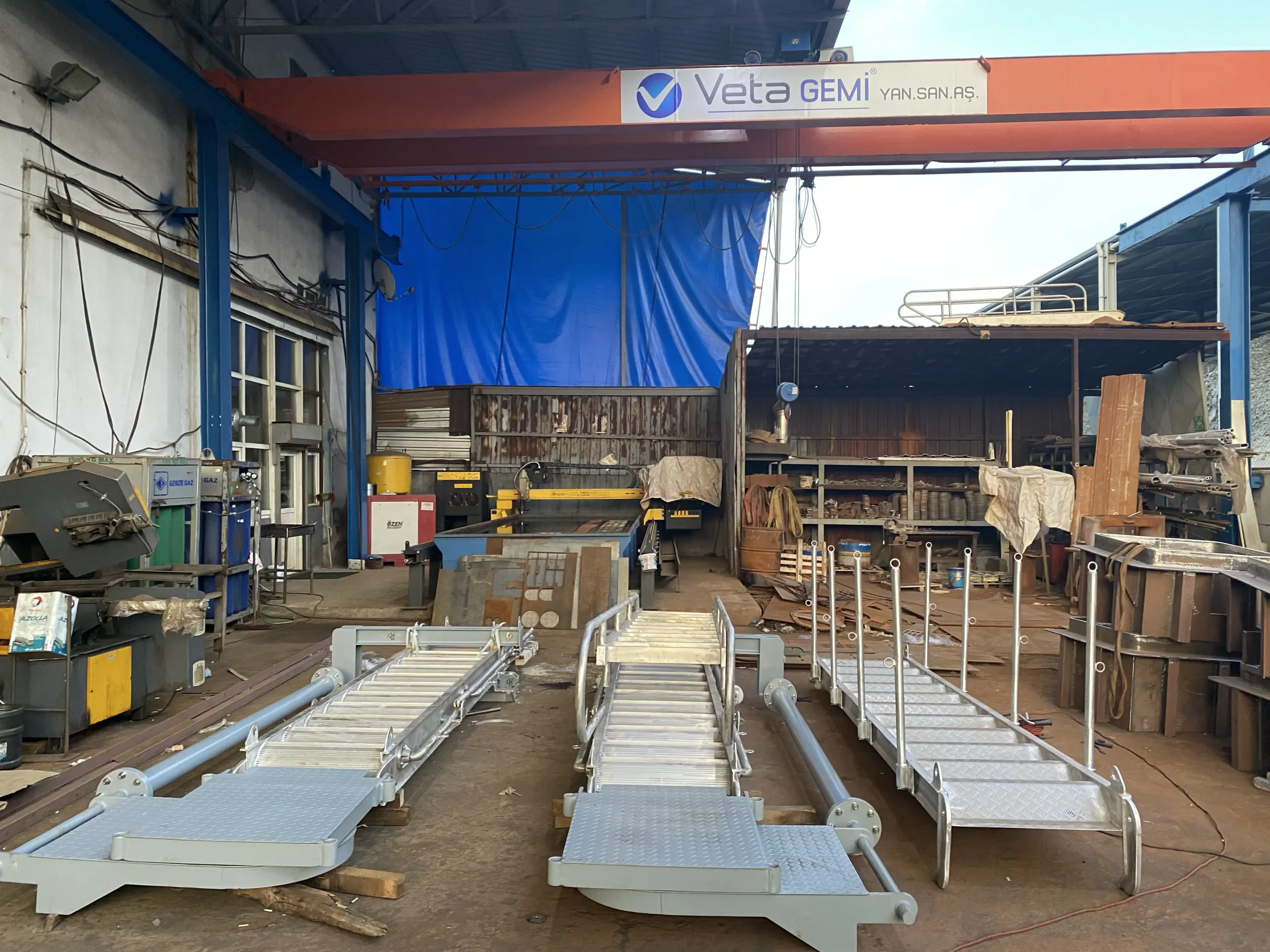 The accommodation ladder is a critical ship equipment for safe embarkation and disembarkation of crew, pilots and visitors. At Veta Gemi A.Ş. (Yalova, Turkey), we design and manufacture SOLAS-compliant accommodation laddersthat combine lightweight construction, high strength and long-term corrosion resistance. Built in our Yalova shipyardwith marine-grade aluminum and stainless steel hardware, each ladder delivers dependable performance in harsh sea conditions and meets the requirements of leading classification societies.